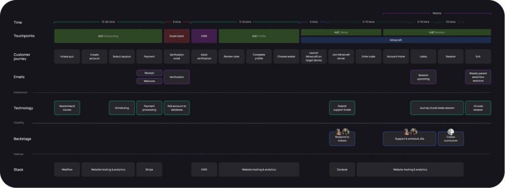To prepare an effective implementation of the new design system, I also quickly conducted a UX audit of all current screens, flows, and processes, then created a service blueprint to provide a clear visual reference for product enhancement discussions within the team. Through team observations, user interviews, and a healthy dose of dogfooding, we identified four critical opportunities: